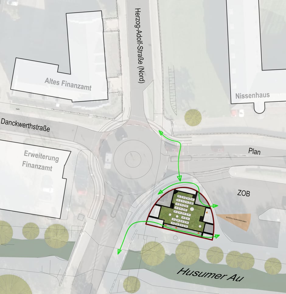 Der Pavillon am Husumer ZOB wird die neue Anlaufstelle für die Busfahrer: innen der örtlichen Buslinien. Weiterhin werden die öffentlichen Toiletten integriert. Der derzeitige Container mit einem